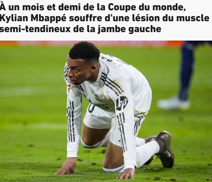 《队报》表示:皇马的公告排除了姆巴佩腿筋严重受伤的可能性。本赛季姆巴佩各项赛事代表皇马出战41场,是出场数最多的球员之一。